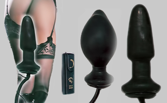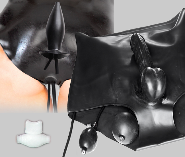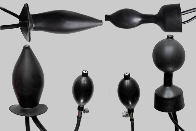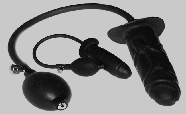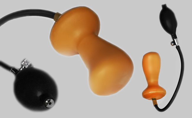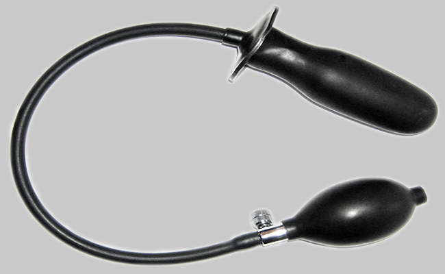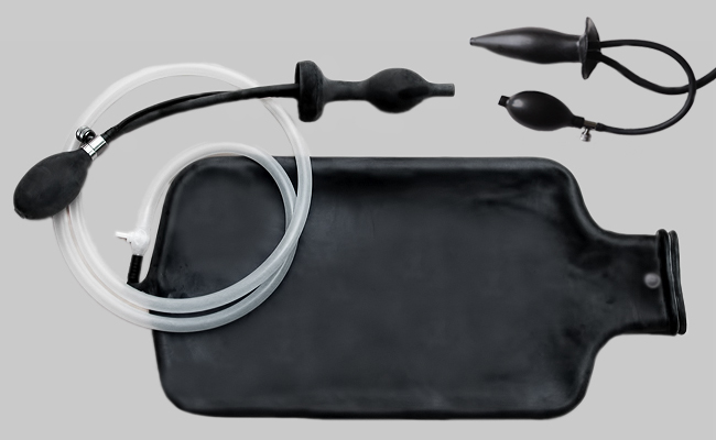 und einem aufblasbaren Klistierzapfen. Der Klistierbeutel hat die Form